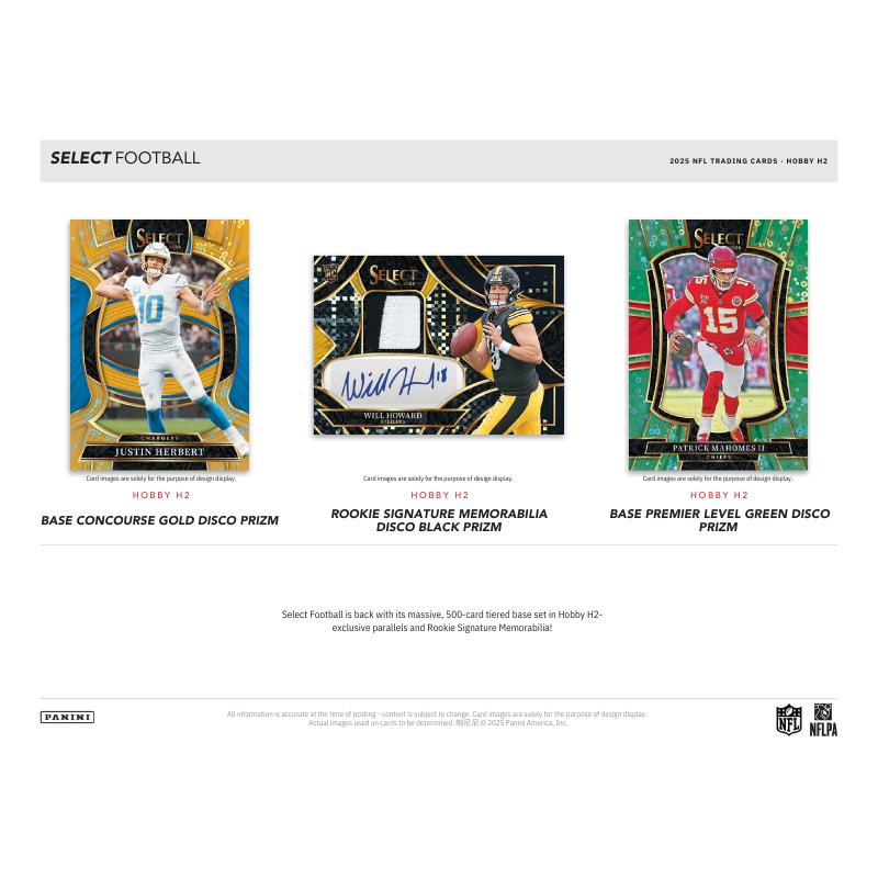 - Select Football is back with its massive, 500-card tiered base set in Hobby H2-exclusive parallels and Rookie Signature Memorabilia!